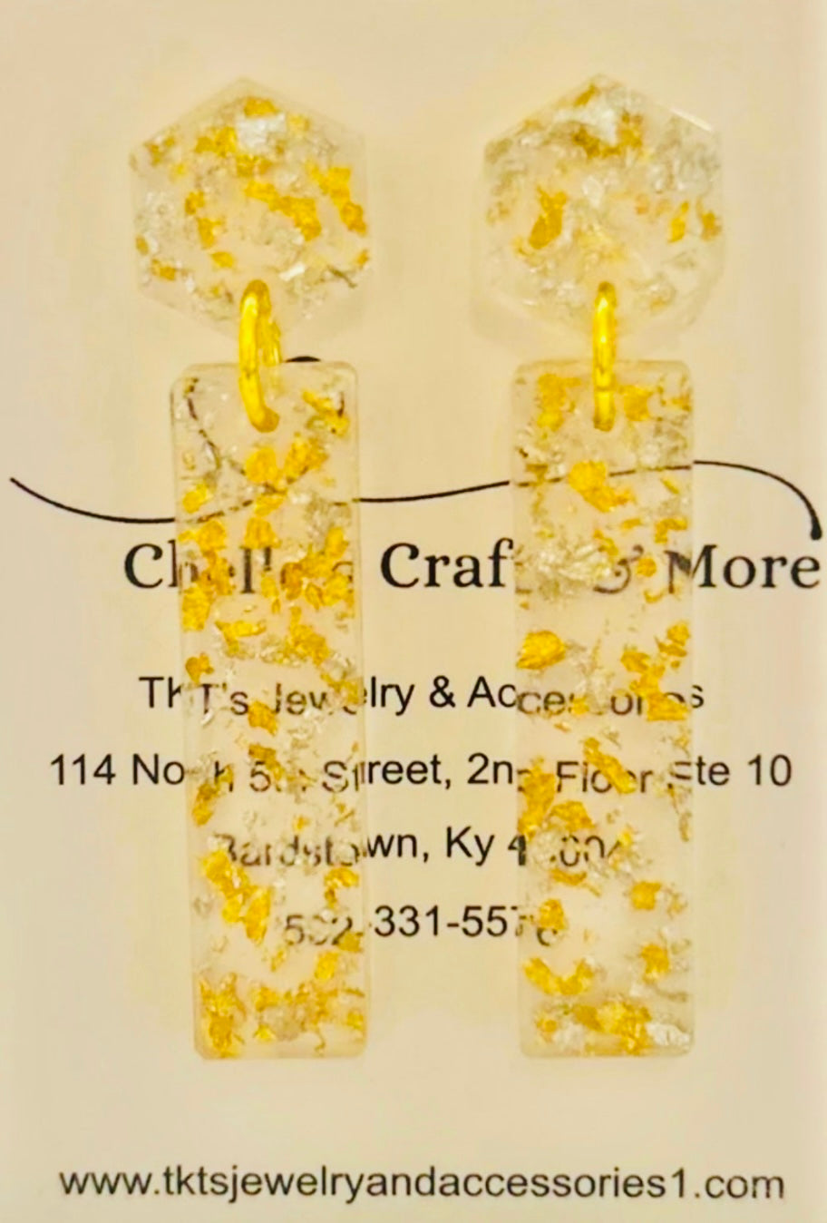 They are a striking set of clear, geometric resin drop earrings featuring mixed gold and silver metallic flakes, perfect for a contemporary or statement look.