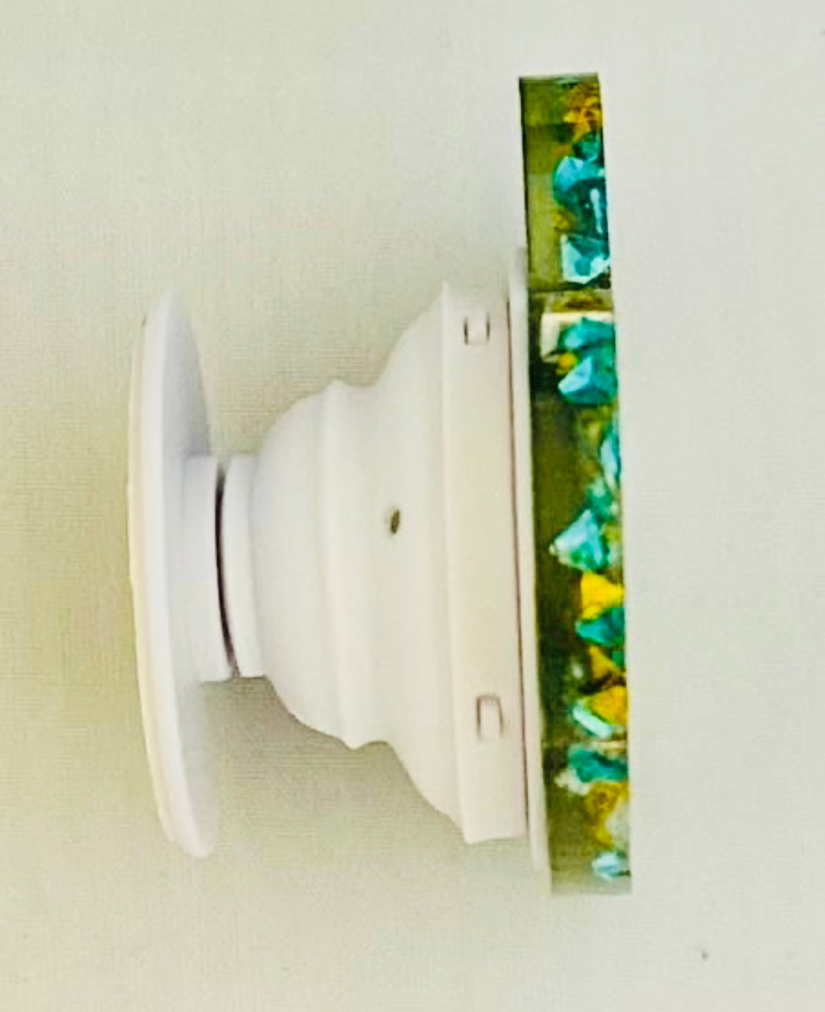 This pop socket has a heart shape and a mosaic design filled with sparkling, geometric pieces. The pattern is a lively mix of gold, yellow, and shimmering teal triangle and square shapes suspended in a clear, glossy resin.