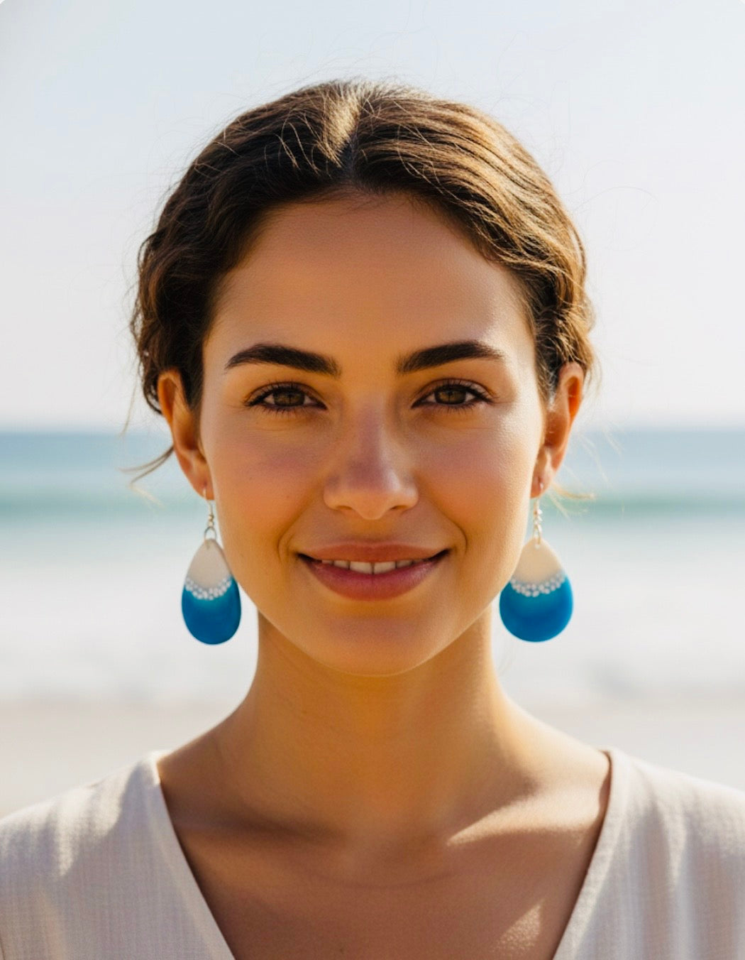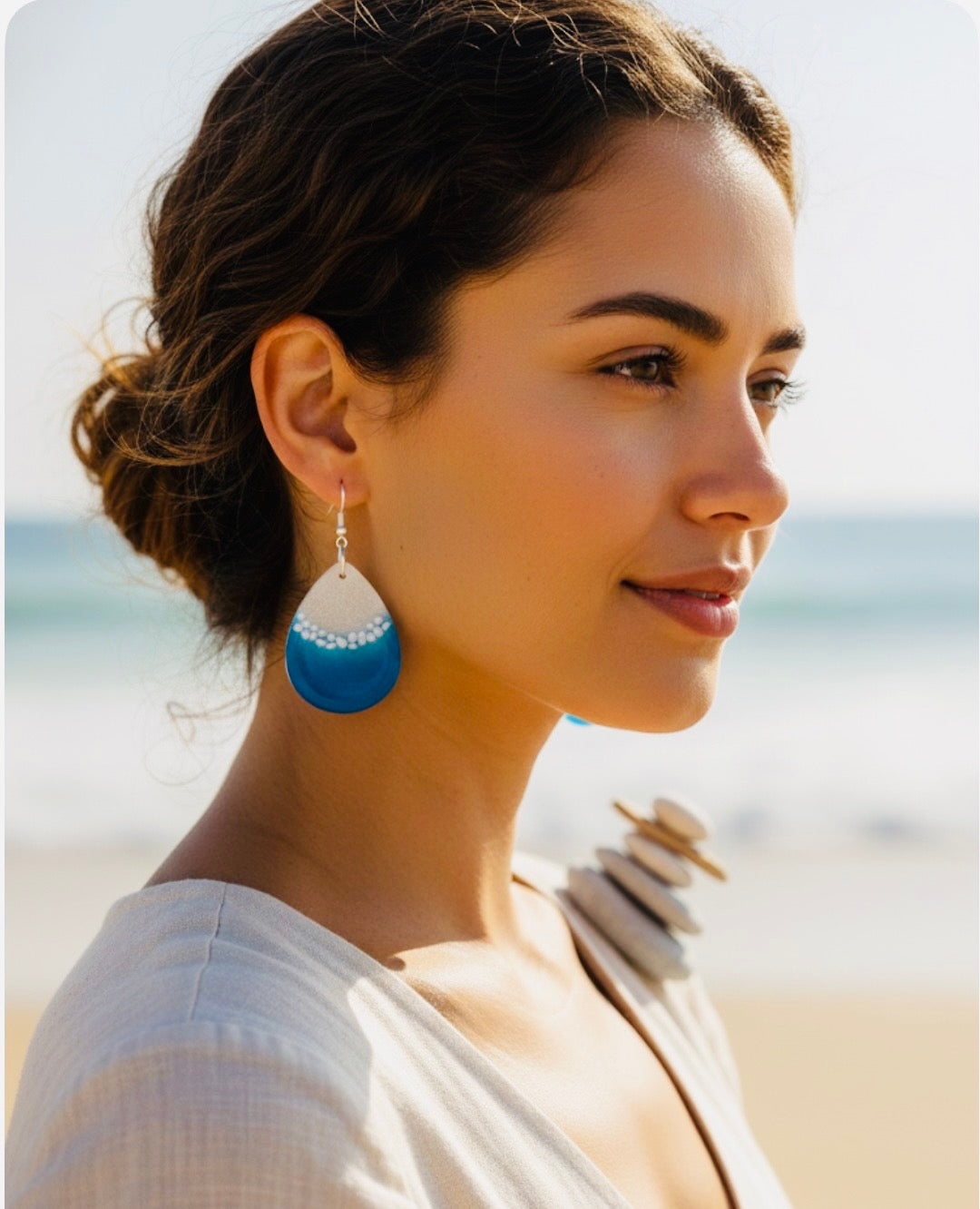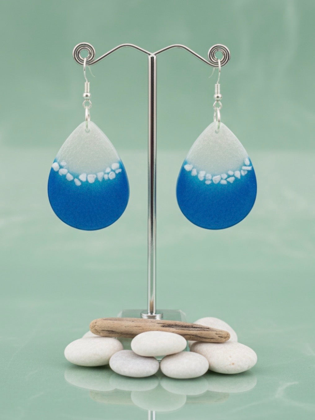 These striking resin made drop earrings have a unique two-toned design that captures the essence of the ocean. The lower half features a vibrant, deep cobalt blue, while the upper section is a shimmering white filled with small, crushed rocks. This combination creates a beautiful, cascading effect, reminiscent of whitecaps on the deep blue sea.