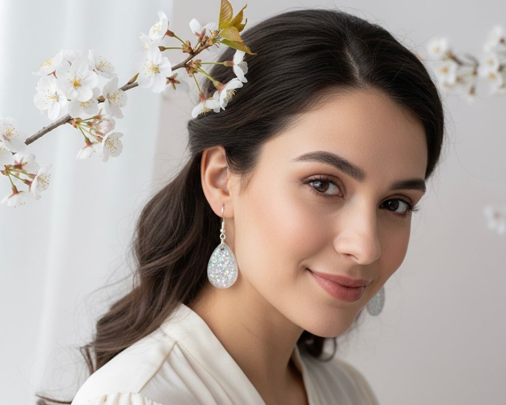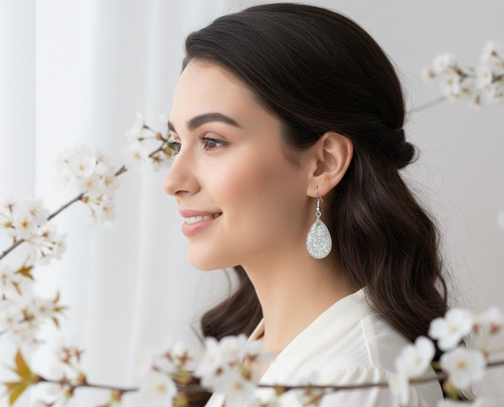 The transparency and intense sparkle evoke images of ice, fresh snow, or crystalized frost, making them a perfect accessory for winter or holiday events.