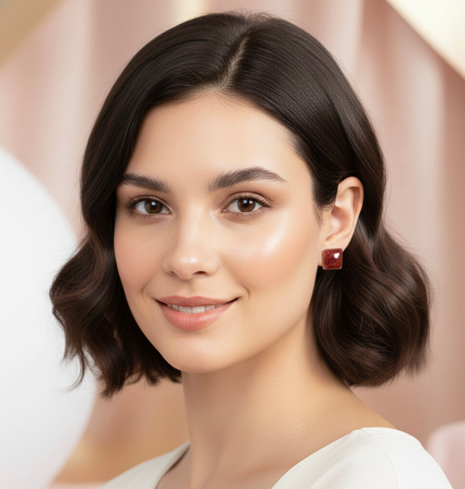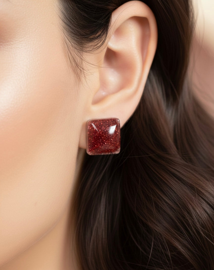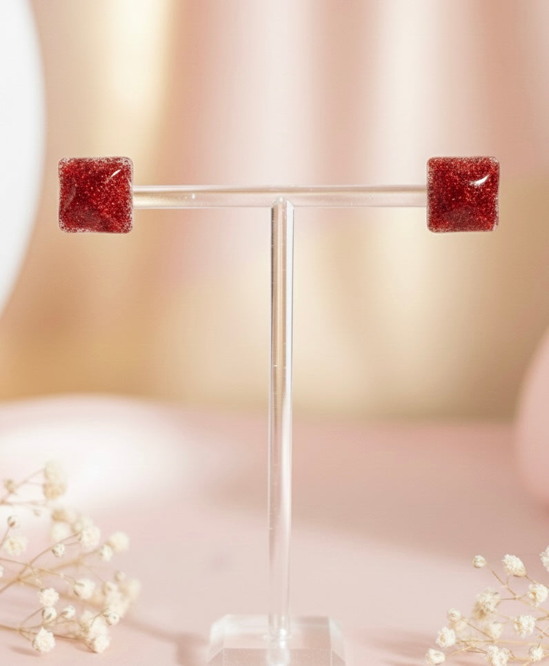 These earrings are a striking deep red, square-shaped stud design, perfect for a bold Holiday or Valentines Day look!