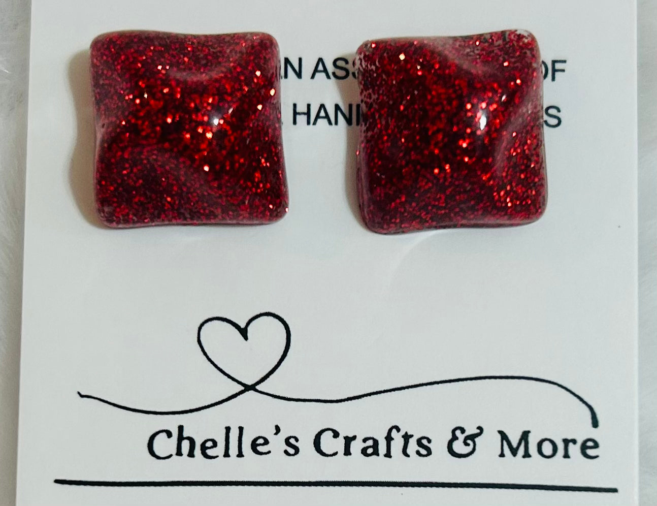 These earrings are a striking deep red, square-shaped stud design, perfect for a bold holiday look!