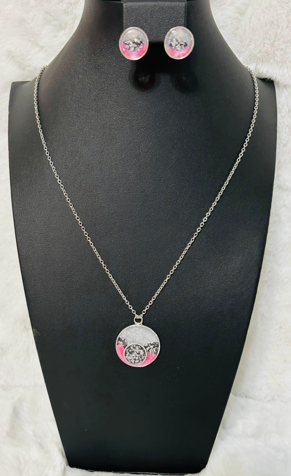 Elevate your accessory game with this two-piece resin mad set. Featuring a stylish necklace and matching stud earrings, perfect for adding a pop of color and dynamic sparkle.