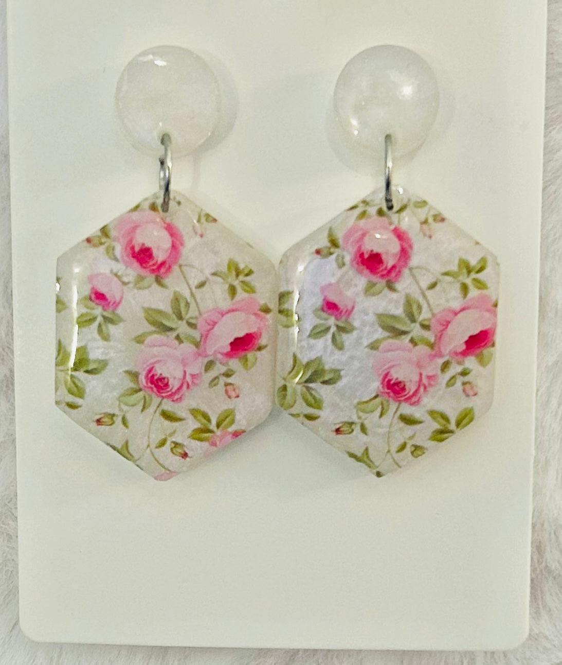 The earrings are made from a glossy, opaque resin or acrylic featuring a classic, chintz-style floral print. The pattern consists of soft pink and magenta roses with delicate green leaves scattered across a pale, luminous off-white background. This pattern evokes the look of vintage wallpaper or fine china.