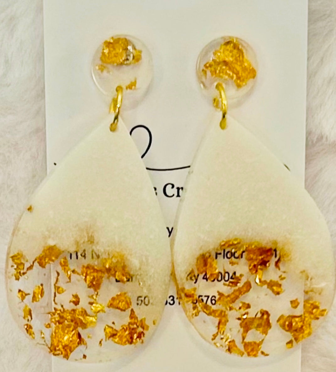 Near the ear, a small, flat, circular disc crafted from smooth, opaque creamy white resin initiates the design. It contains a delicate scattering of gold foil, hinting at the splendor of the main dangle.