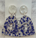 These resin made earrings are a tribute to classic artistry. They feature a striking, teardrop-shaped design with a rich blue-and-white floral pattern, reminiscent of traditional Delftware or fine porcelain. The intricate, details create a sense of elegant, timeless beauty. The earrings have a smooth, polished finish, and their lightweight feel makes them a comfortable and sophisticated accessory. They are a statement piece that blends a sense of old-world charm with a clean, modern silhouette.