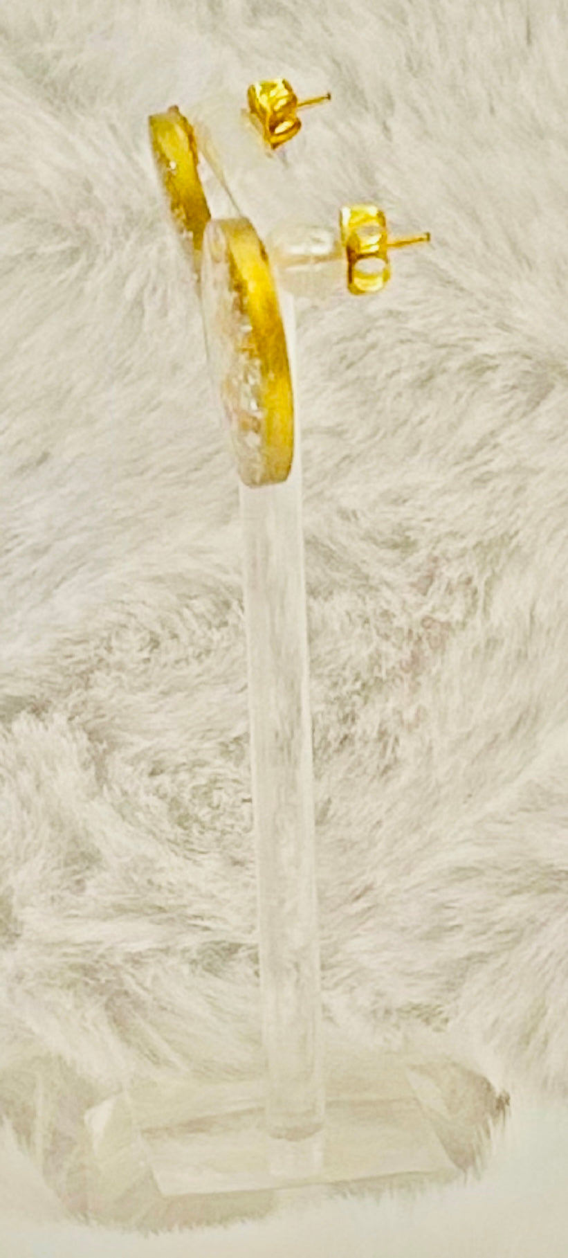 The earrings have a high-gloss, polished finish, which helps to magnify the metallic flakes inside.