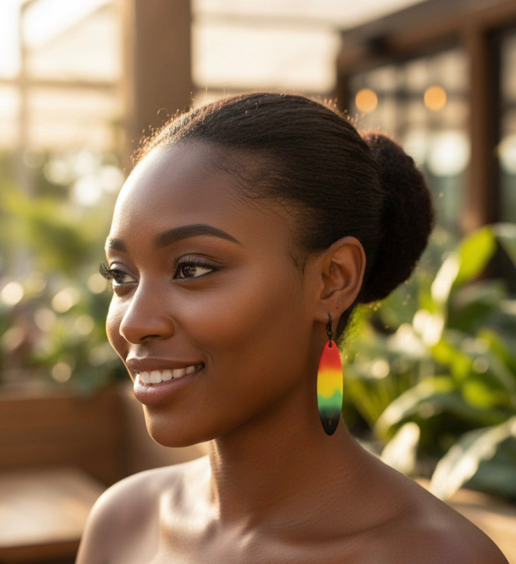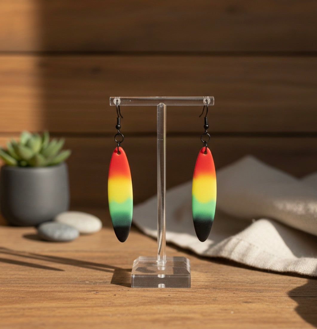 These are long, striking resin drop earrings featuring a bold, tri-color gradient.