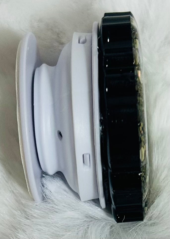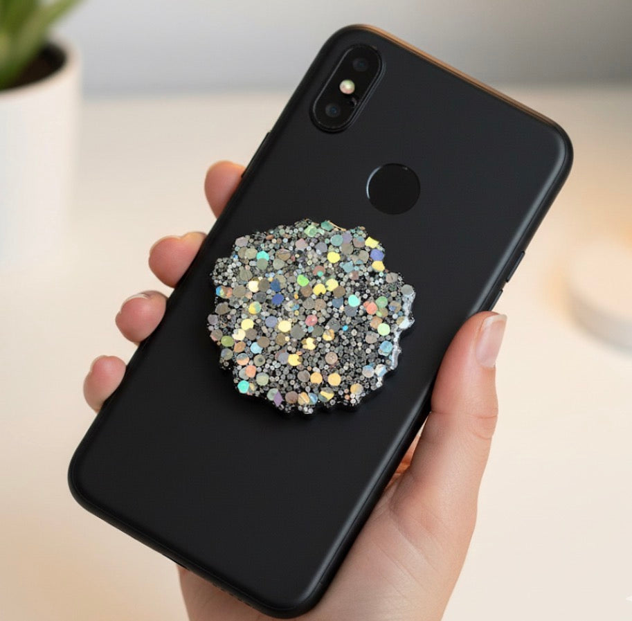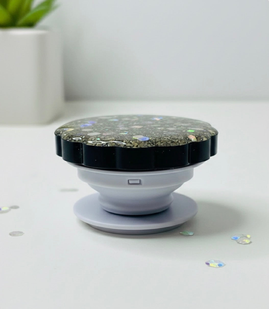 The entire surface is densely packed with chunky, multi-sized glitter suspended in a clear or black resin. The primary tones of the glitter are silver and dark gray, giving it a high-contrast, moody aesthetic.