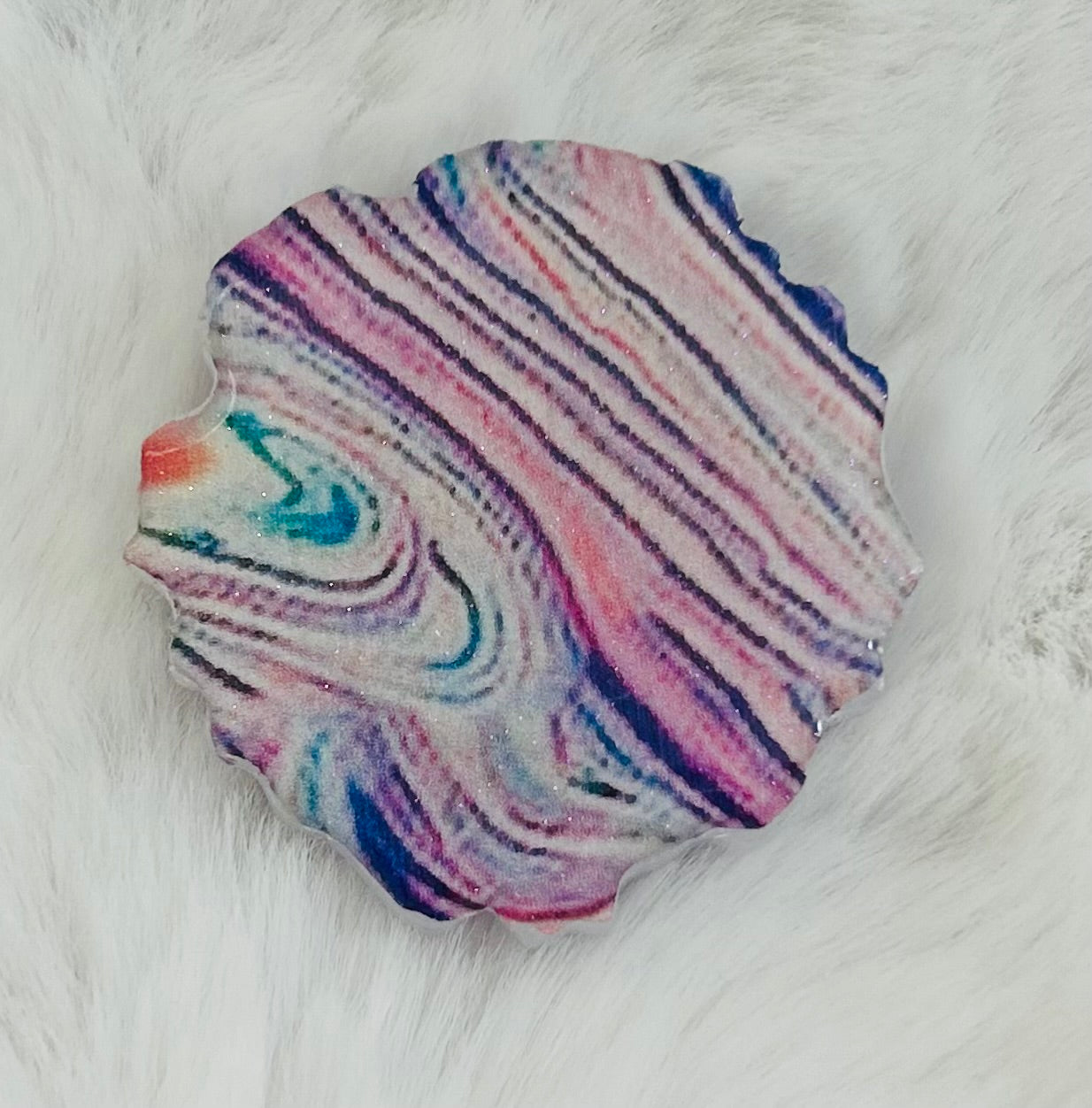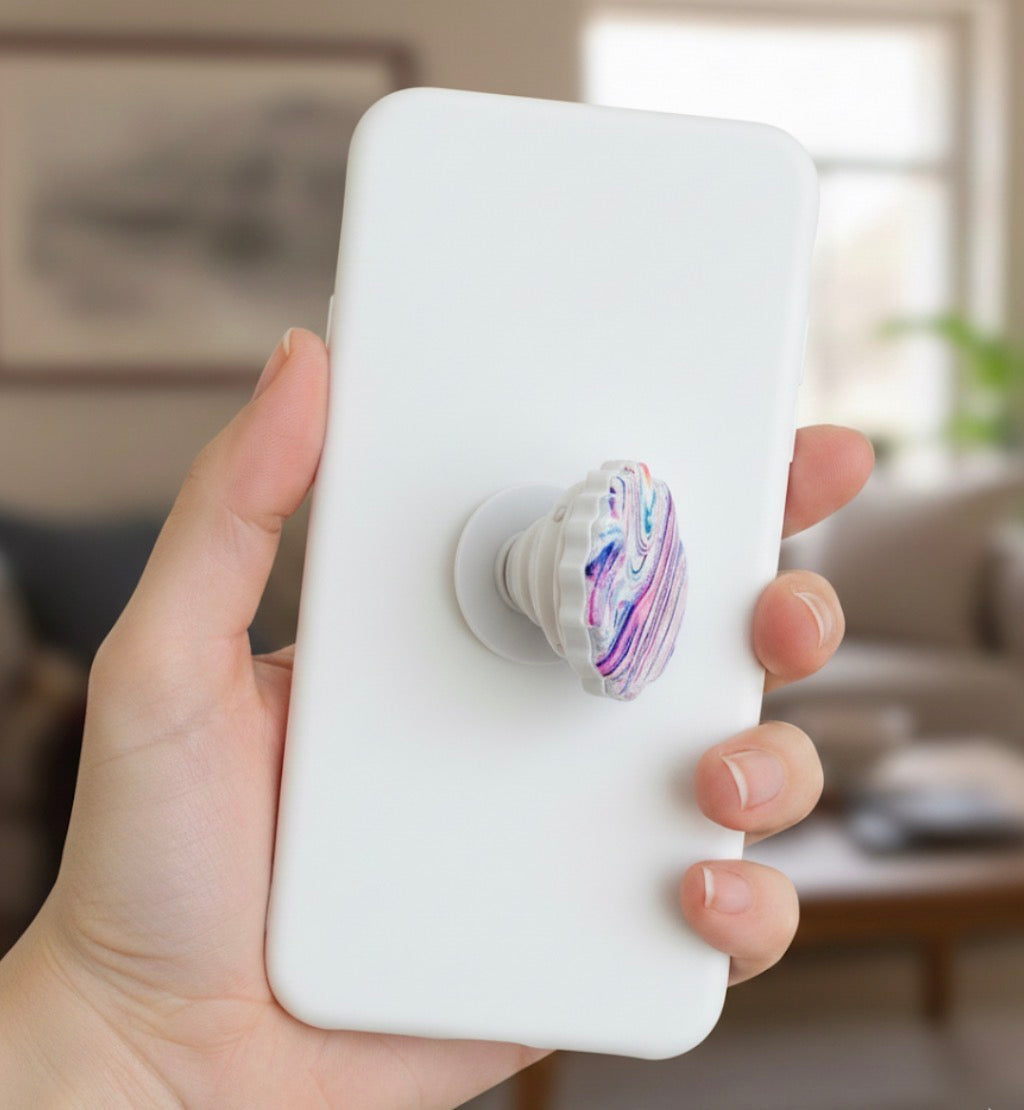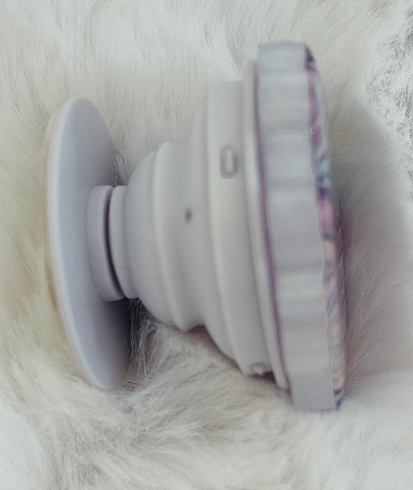 This pop socket features a striking swirl design with a vibrant, iridescent finish. The pattern blends shades of pink, purple, blue, and white in a marbled effect, creating a unique, flowing look. Fine glitter is suspended throughout the resin, giving it a subtle shimmer that catches the light. The scalloped, organic shape adds a soft, natural touch to the abstract design.