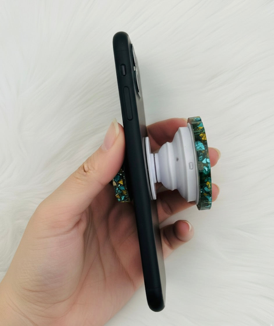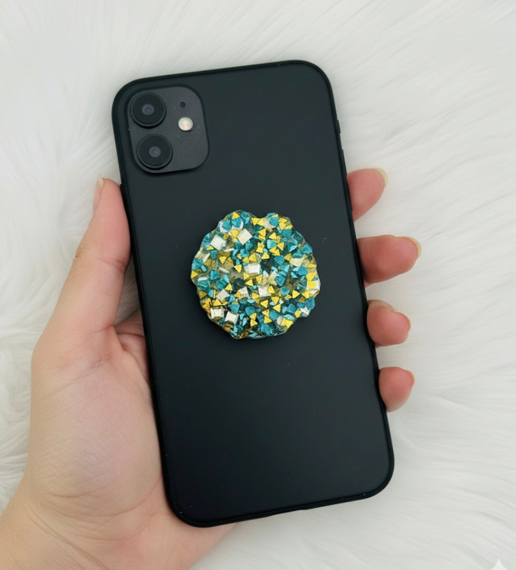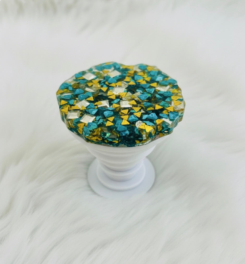 This pop socket has a dynamic, abstract design. It is filled with a variety of small, multi-faceted shapes, including triangles and squares. The color palette is a striking combination of teal, gold, and silver, with the pieces appearing to be suspended in a clear resin. This gives the pop socket a textured, three-dimensional look that resembles a mosaic or a collection of glittering jewels.