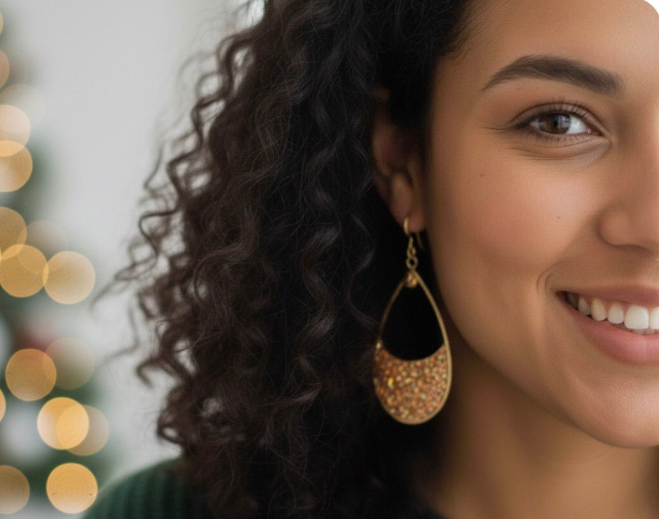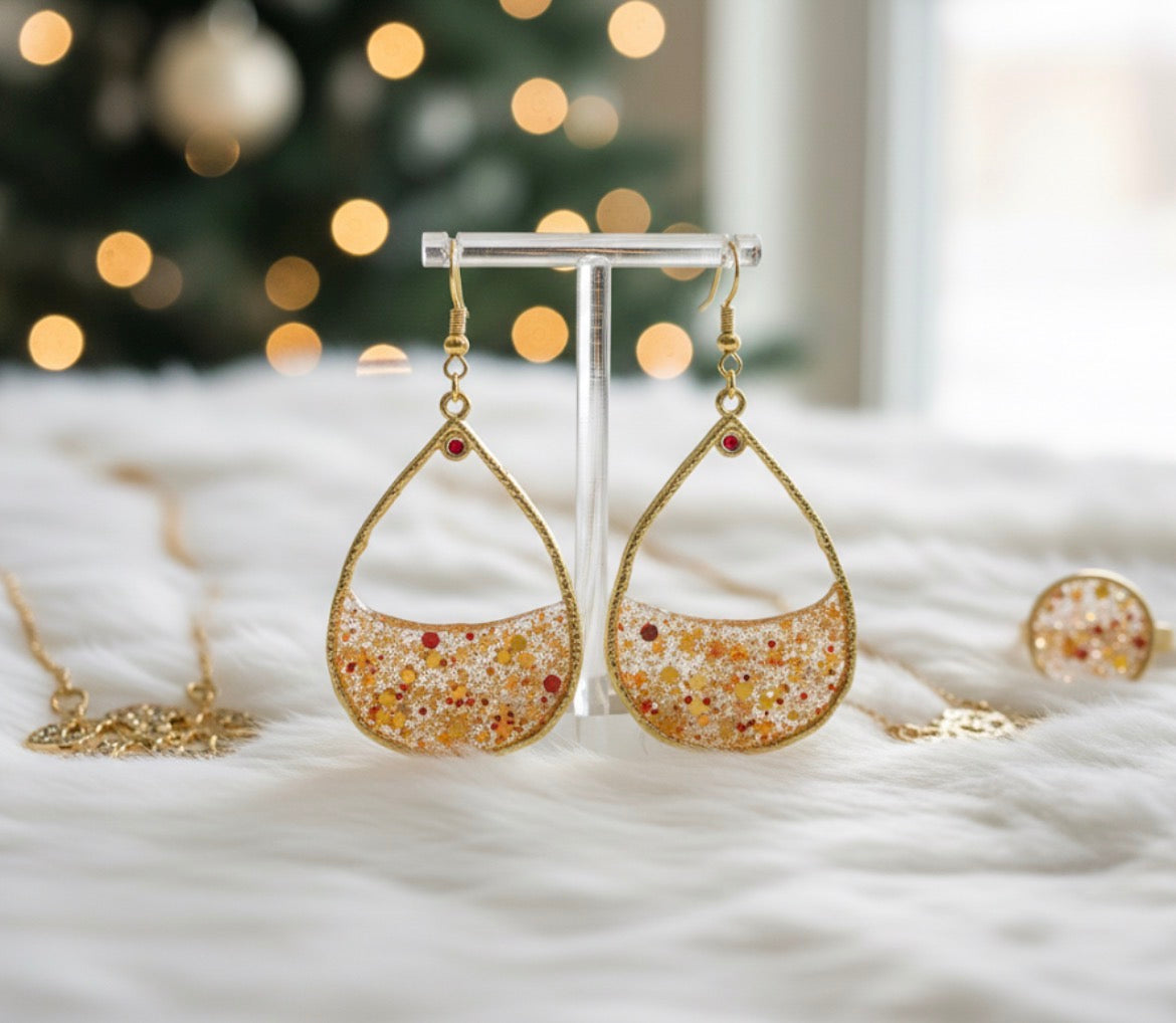 These are a beautiful pair of dangle earrings featuring a unique, open-frame design with a shimmering resin and glitter.