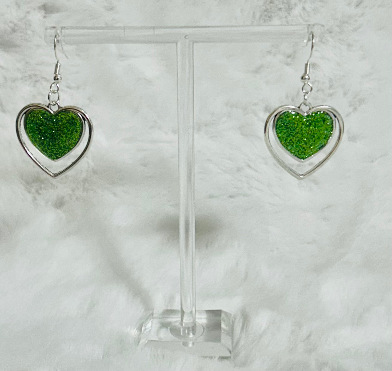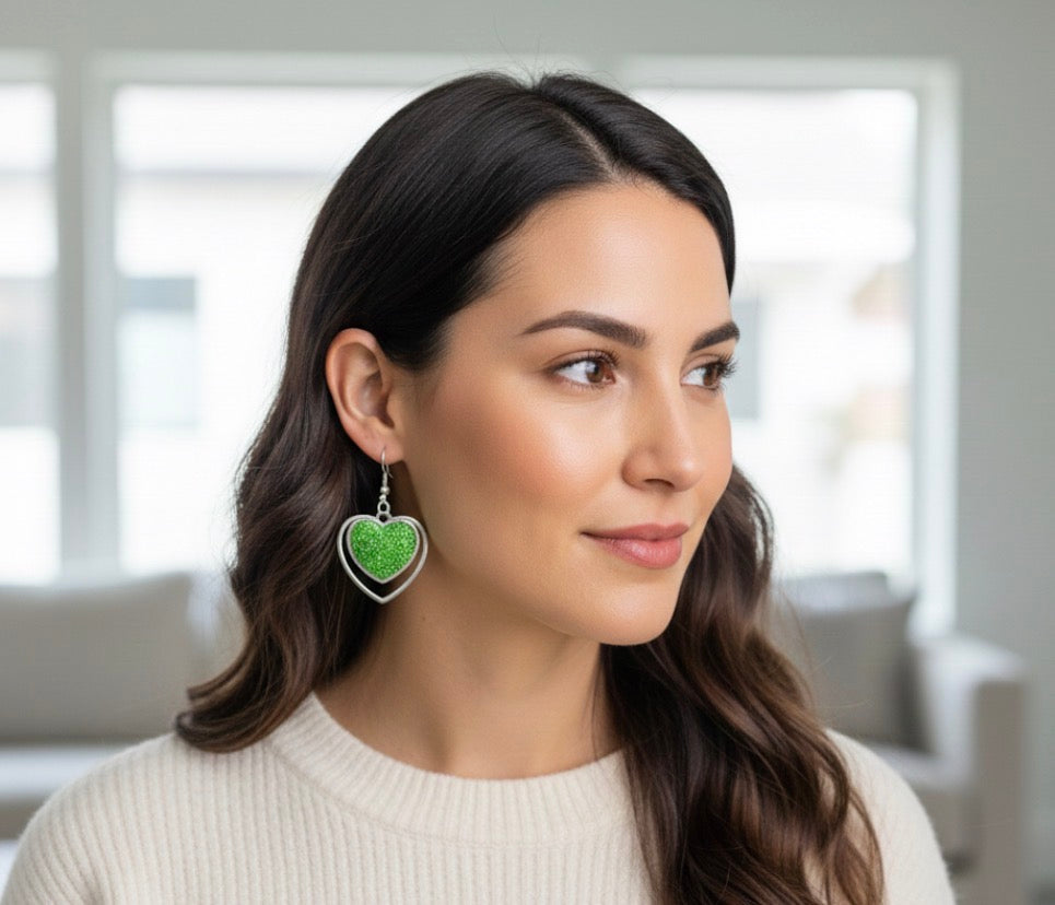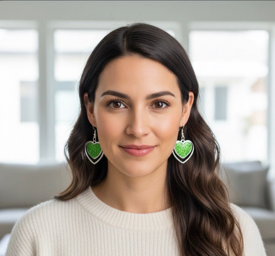 The inner heart is filled with a bold, vibrant green glitter giving the earrings a luminous and eye-catching texture. The green color is a deep, rich shade, similar to emerald.