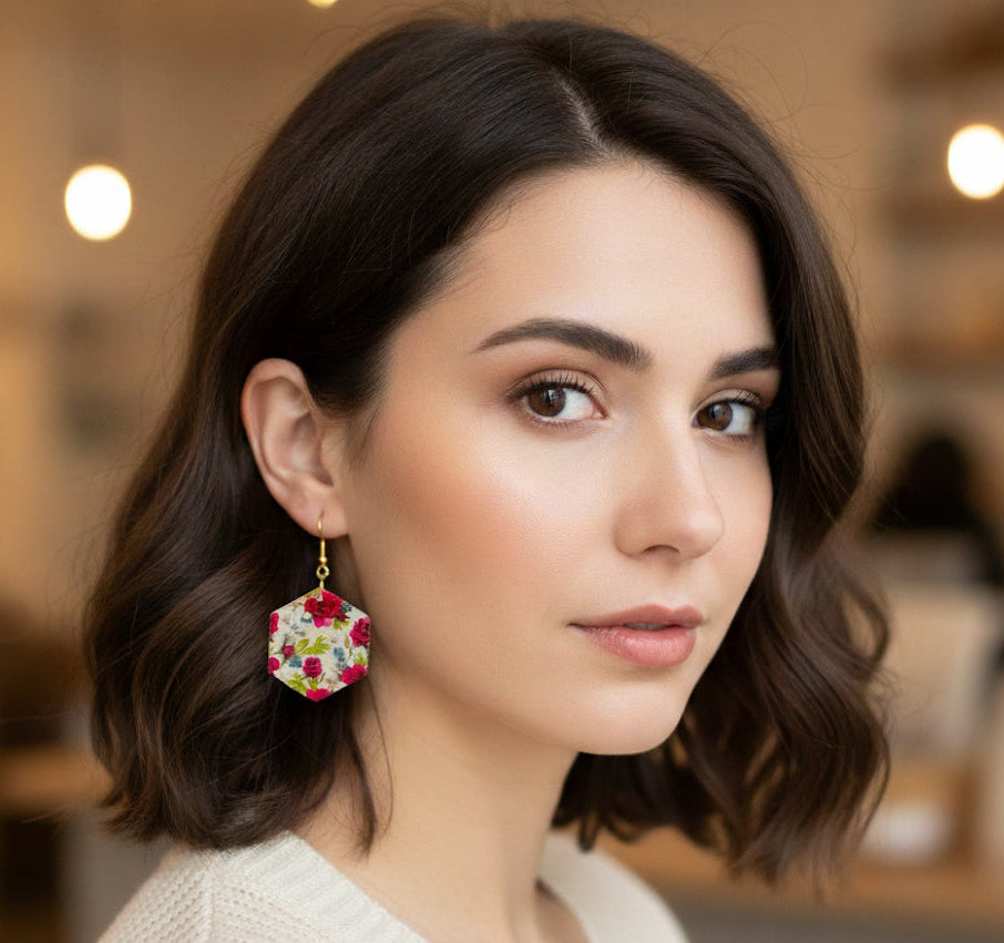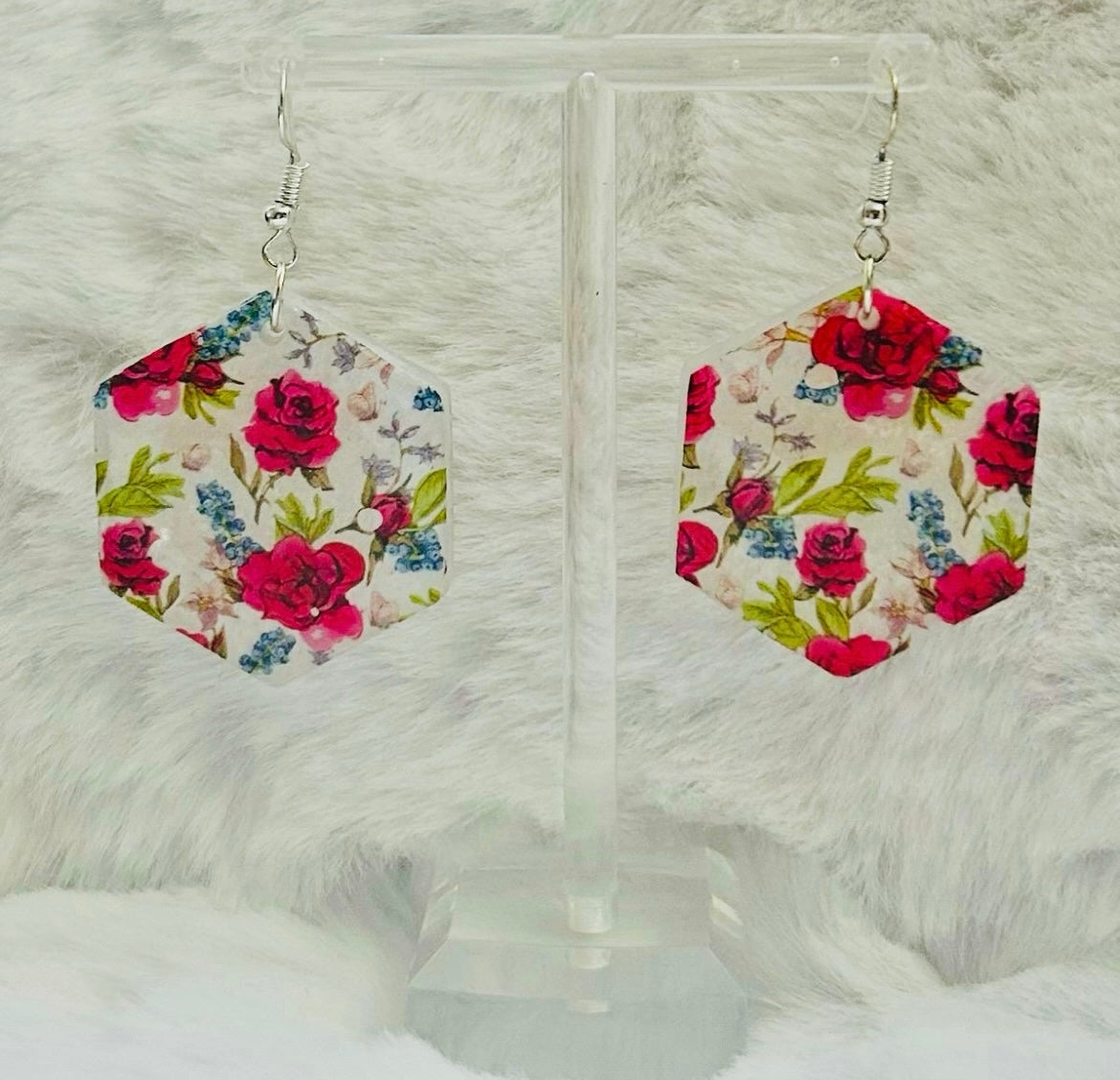 These are a beautiful pair of hexagonal dangle earrings, designed to capture the timeless feel of a beloved garden. Each earring is crafted from a clear, glossy resin with a detailed floral print encased within. The design features lush, vibrant deep red roses and delicate blue wildflowers, set against a subtly mottled off-white background. The modern, hexagonal shape of the earrings provides a fresh contrast to the classic, sentimental floral pattern. Suspended from simple silver-toned hooks, these earrings are a perfect accessory that combines a sense of nostalgia with a touch of contemporary style.