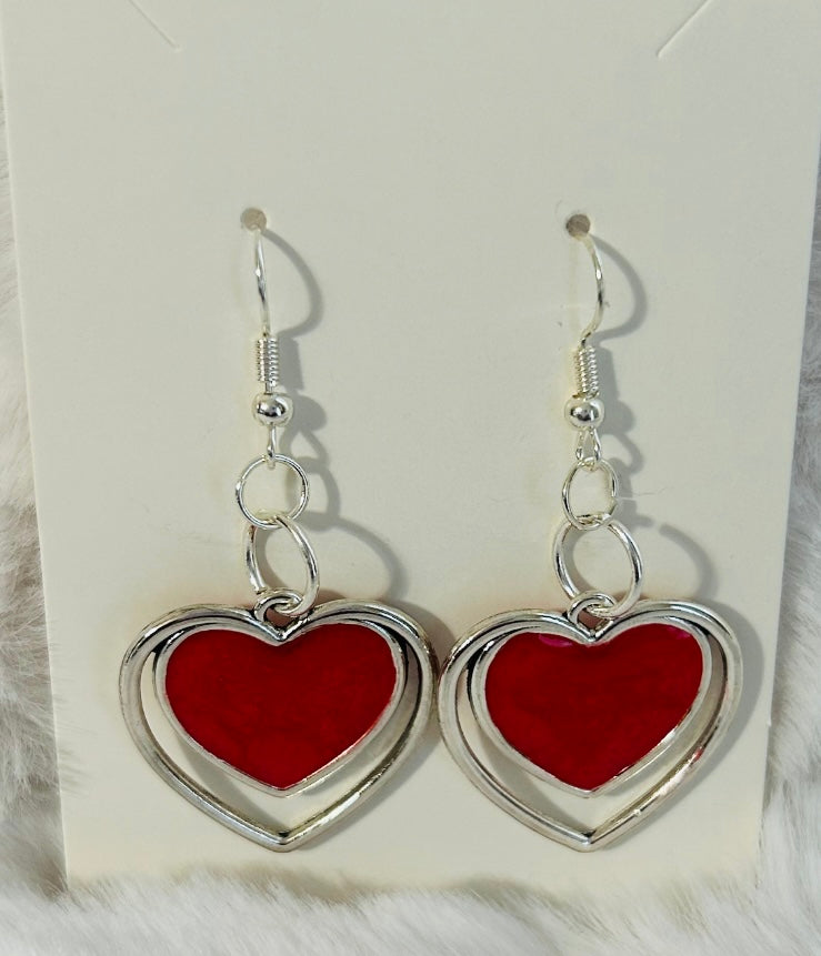 These are dangle earrings suspended from a silver-toned fish hook wire. The main body features a double heart design where a solid, smaller heart is framed within a larger, matching heart outline.