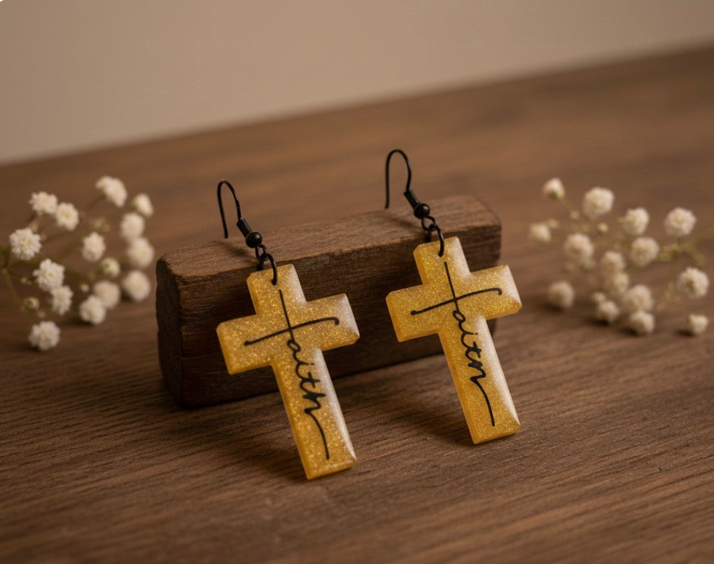 Each cross is inscribed with the word "faith" in a delicate, black cursive script. The "f" of the word cleverly serves as the vertical beam of the cross, while the horizontal stroke of the "t" forms the crossbar.