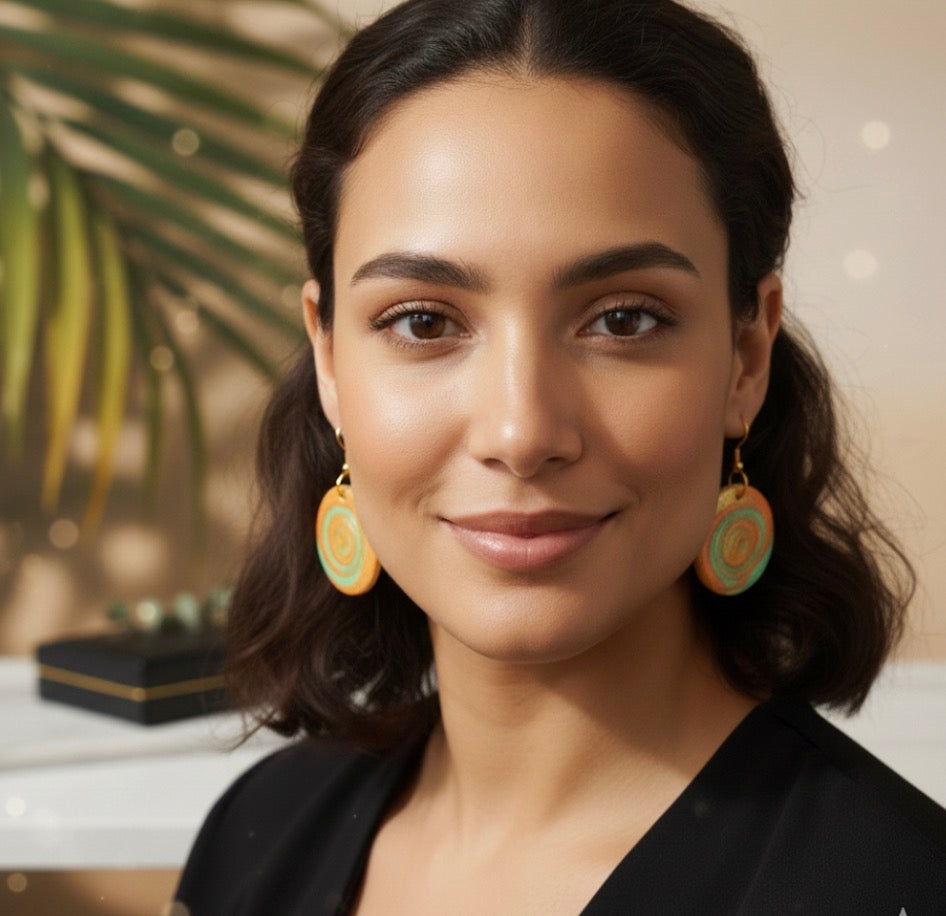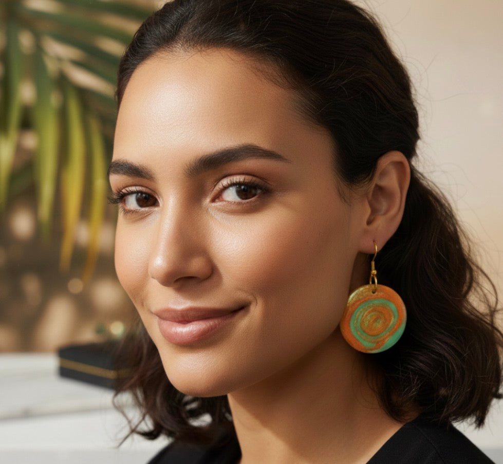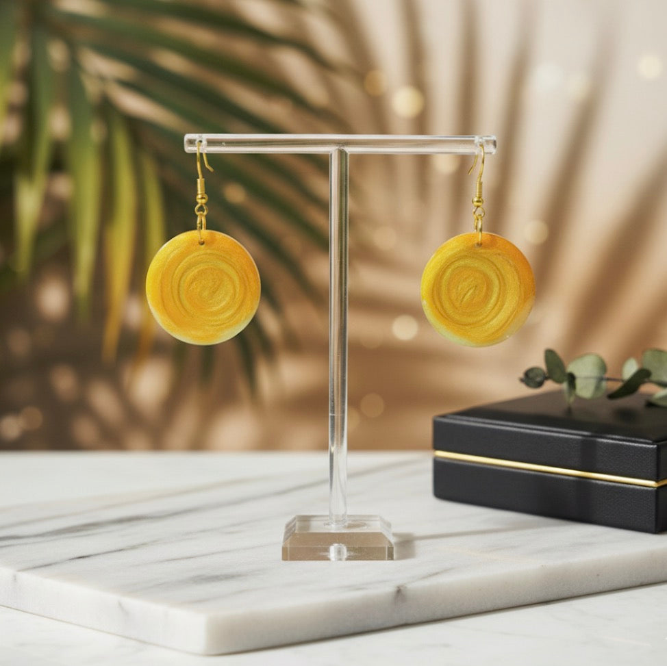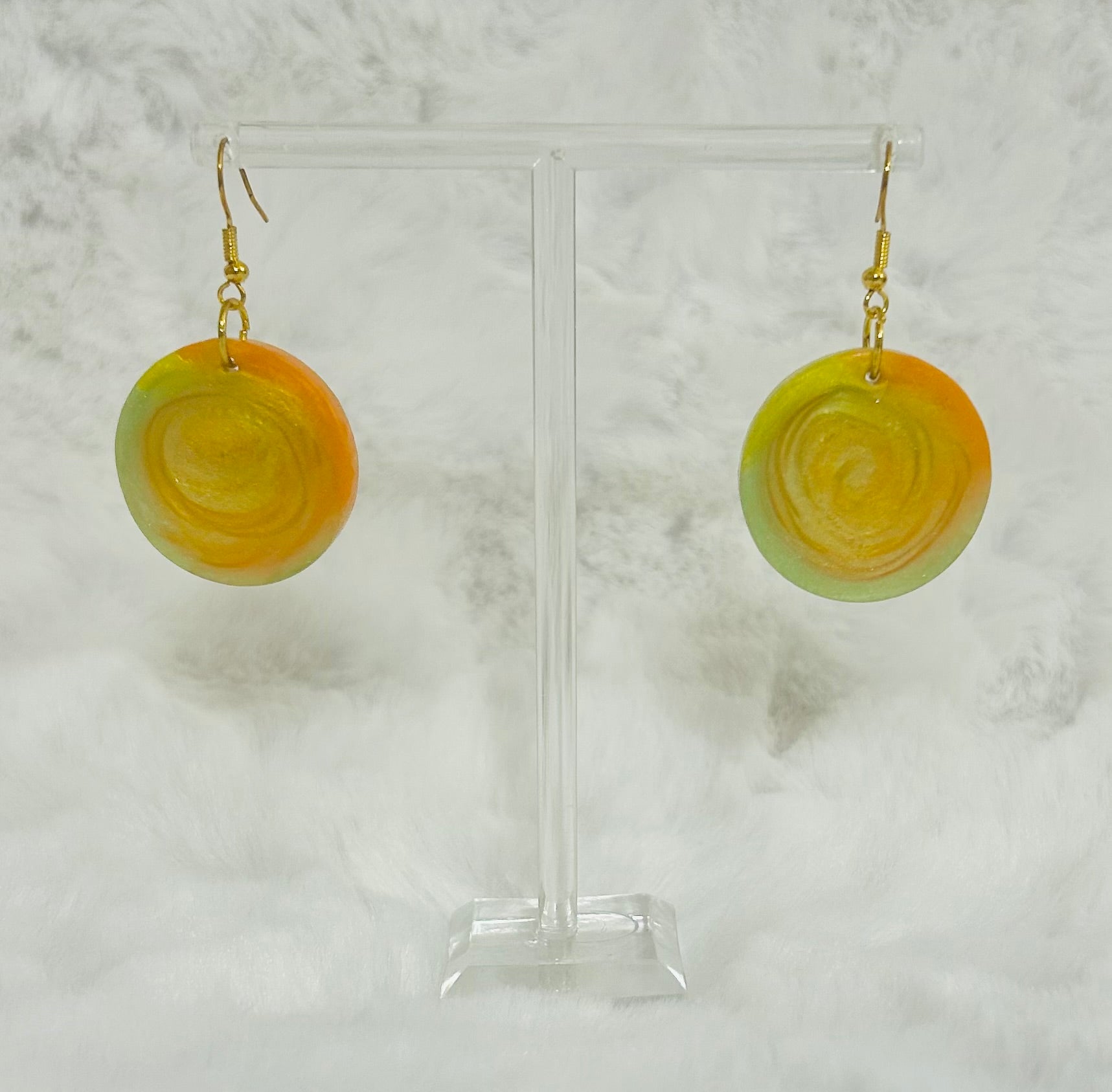 The main body of the earring is a flat, circular disc. The surface of the disc features a vibrant, swirling, marbled pattern created with what appears to be resin. The colors in the swirl are a warm blend of yellow, orange, and a touch of light green. The swirling pattern gives the impression of movement, similar to an abstract painting or the marbling on a stone.