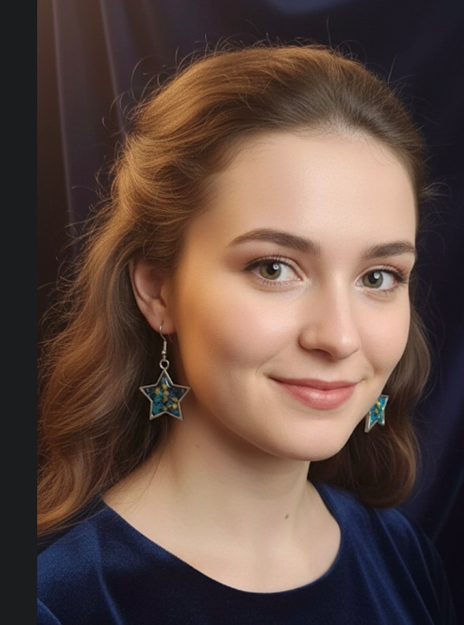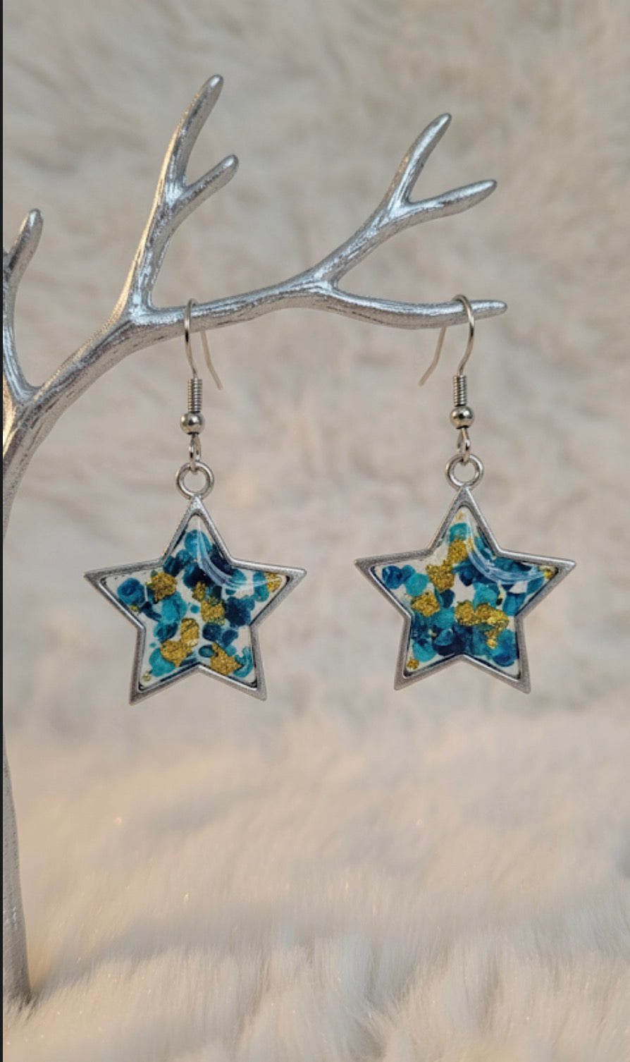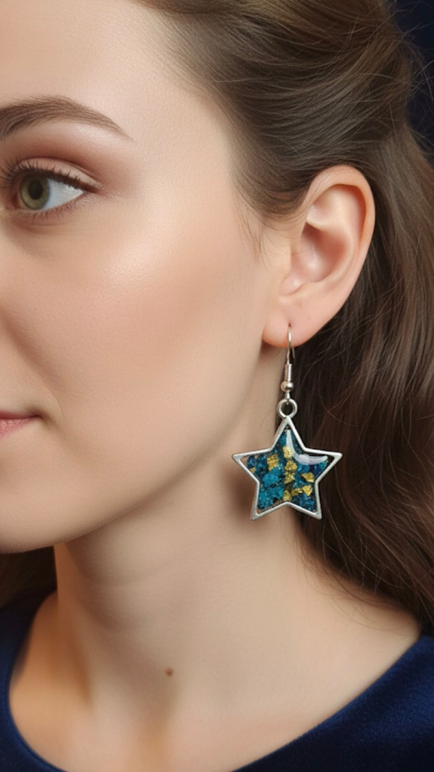 These elegant dangle earrings feature a striking star design with a polished silver-toned frame. The interior of each star holds a beautiful, luminous resin filled with chunky, reflective glitter. The glitter forms a vibrant mosaic of shades of deep blue and turquoise, reminiscent of the clear ocean waters, and is accented with scattered flecks of golden-yellow, evoking the warmth of a sunlit sea. This pair captures the enchanting sparkle of the ocean in a sophisticated and stylish form.