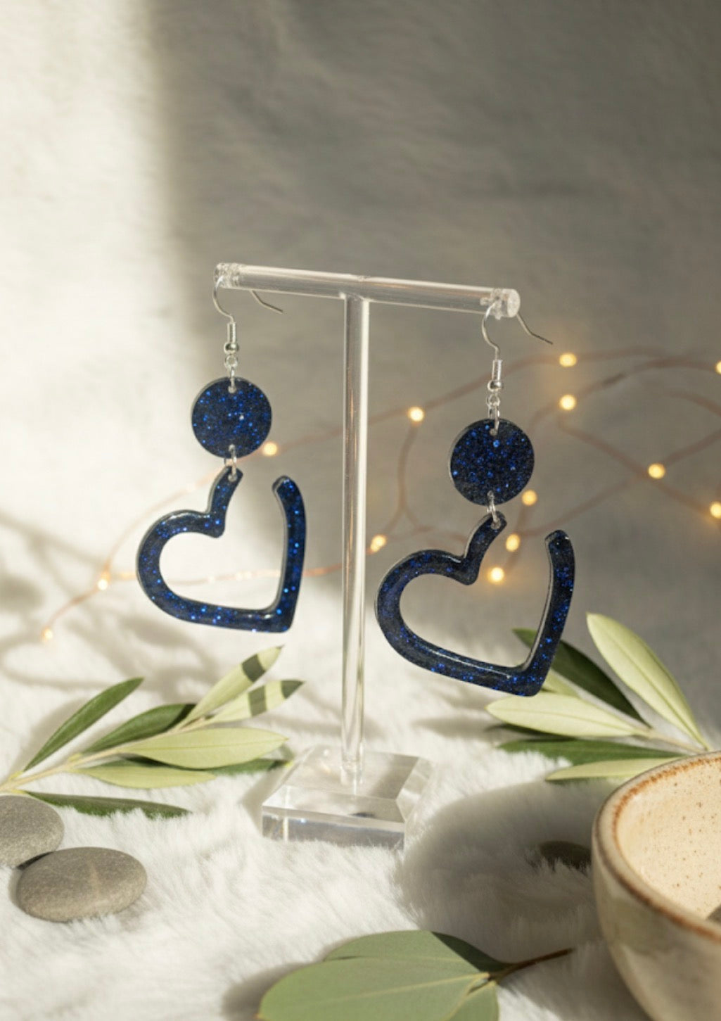 This is a larger, hollow open-heart shape that dangles from the top disc. It is made from the same dark, glitter-infused resin and has a thick, glossy finish.