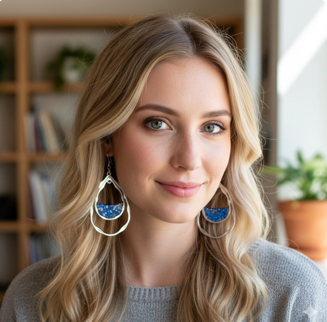 The combination of the cool-toned metal and the deep blue inlay gives these earrings a modern, nautical, or art-deco-inspired aesthetic. They are designed to dangle freely, catching the light and drawing attention.