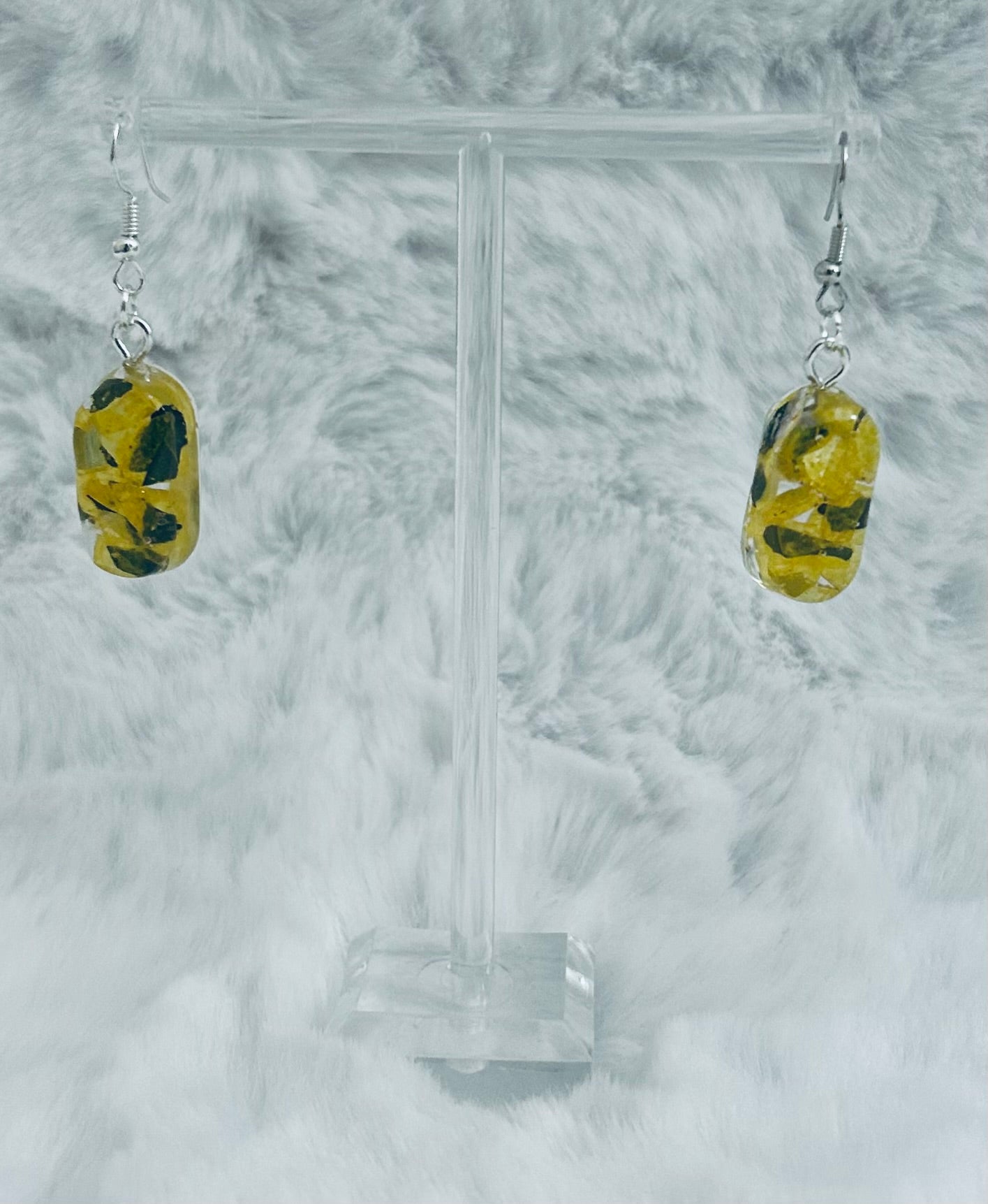 These earrings feature a bold, abstract design, with a translucent, rectangular shape that captures and reflects light. Inside the clear resin are fragmented pieces of vibrant, sunny yellow mixed with striking black flecks, creating a dynamic, mosaic-like pattern. The combination of the warm yellow and the dark contrast gives them a modern, artistic look. They are suspended from a simple, polished silver hook, allowing the light to pass through and highlight the unique internal design.