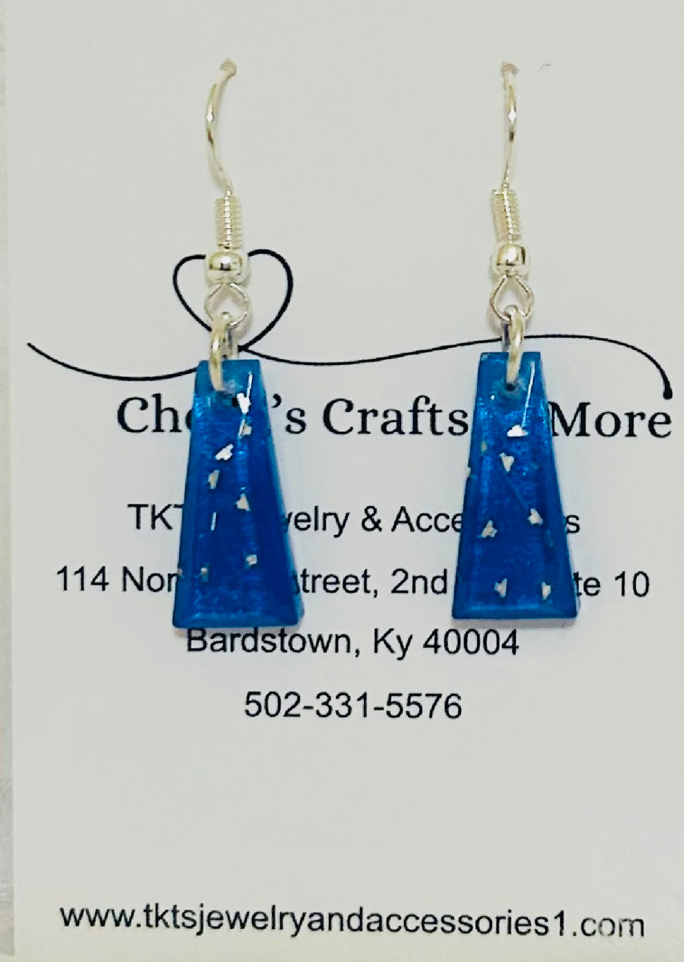 These are a pair of striking, deep blue dangle earrings made from resin, suspended from silver-colored ear hooks.