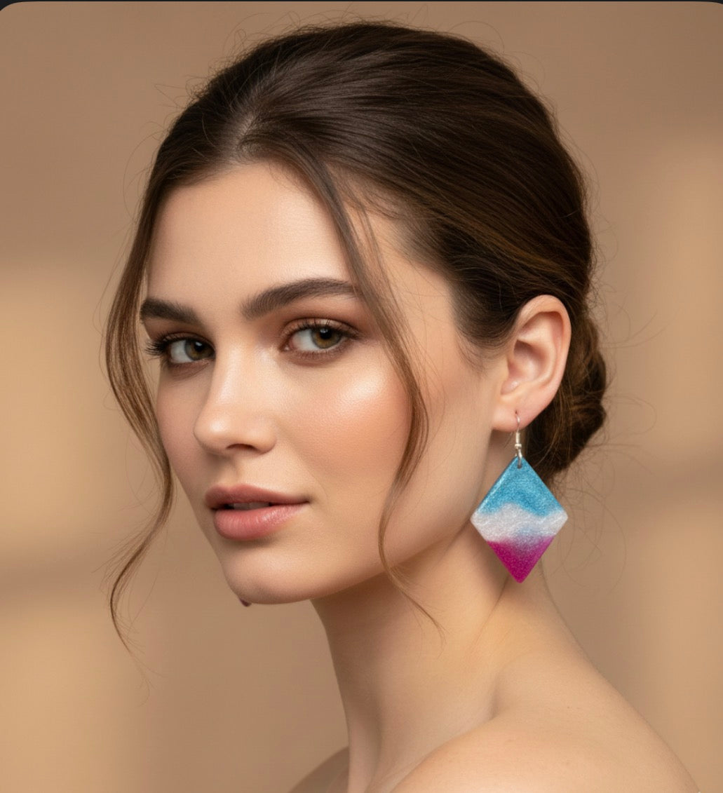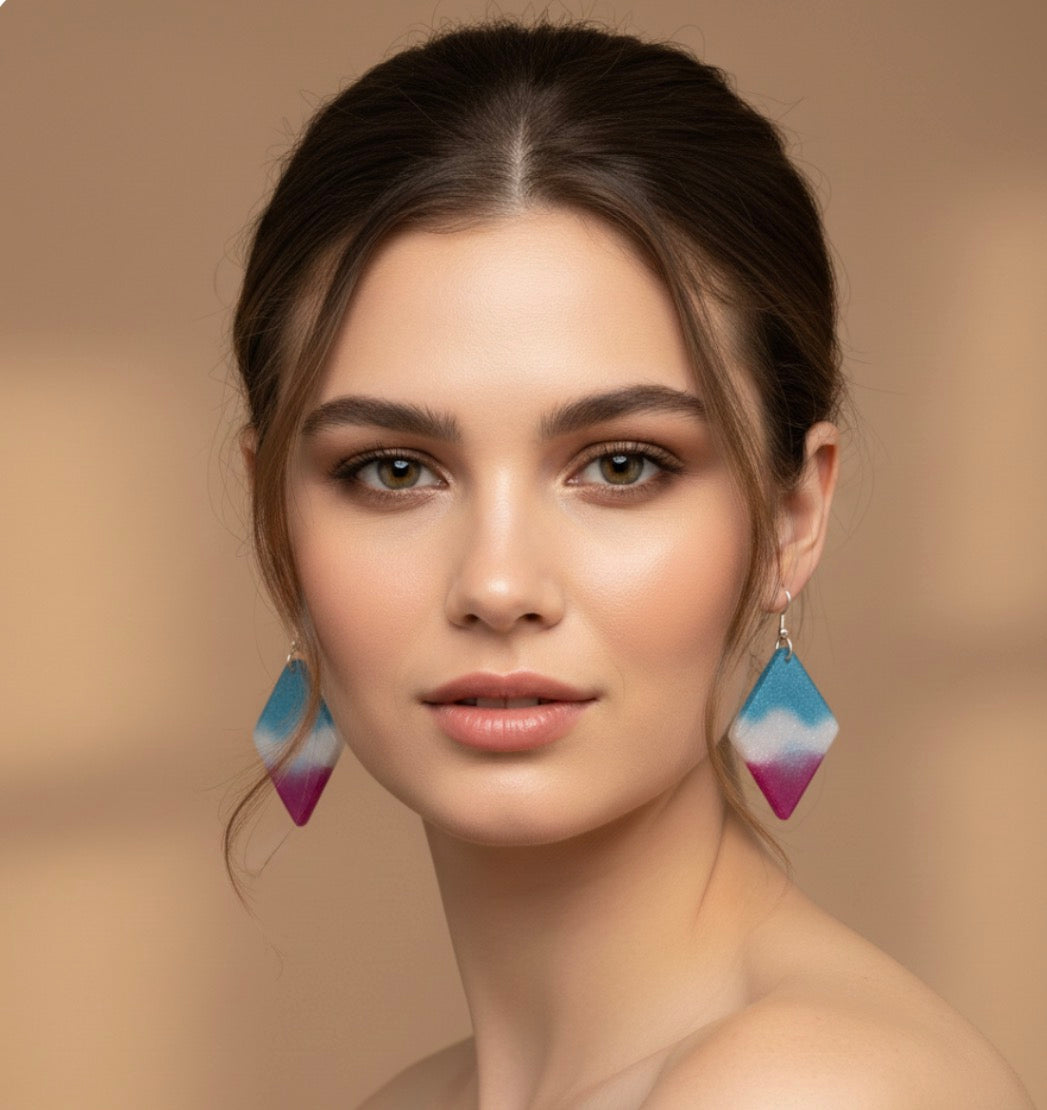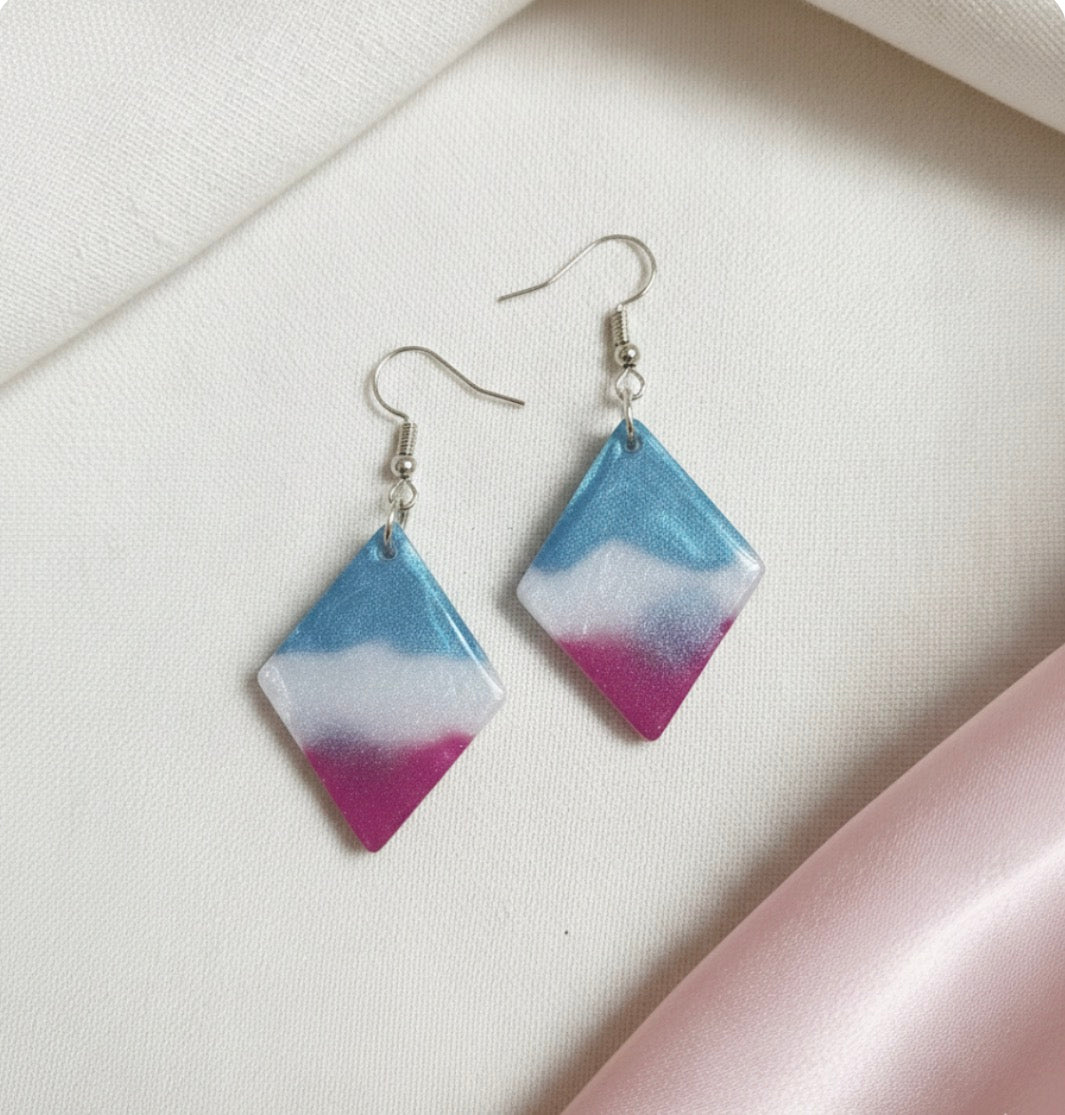 Striking earrings that are diamond-shaped dangles featuring a shimmering, tri-color gradient. The way the earrings bleed into each other gives them a very dreamy, atmospheric feel.