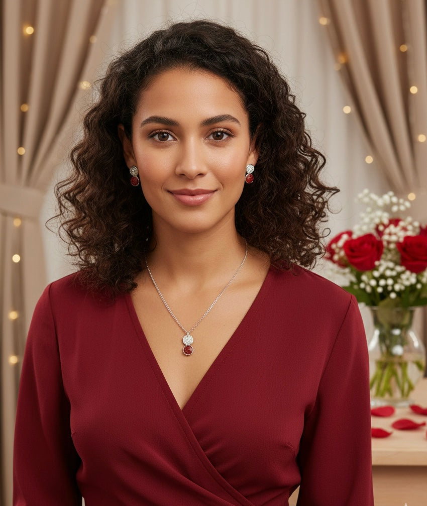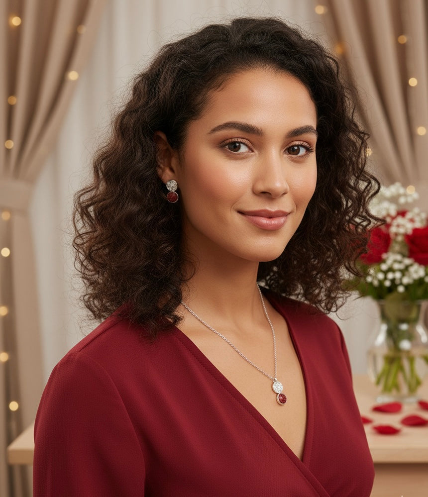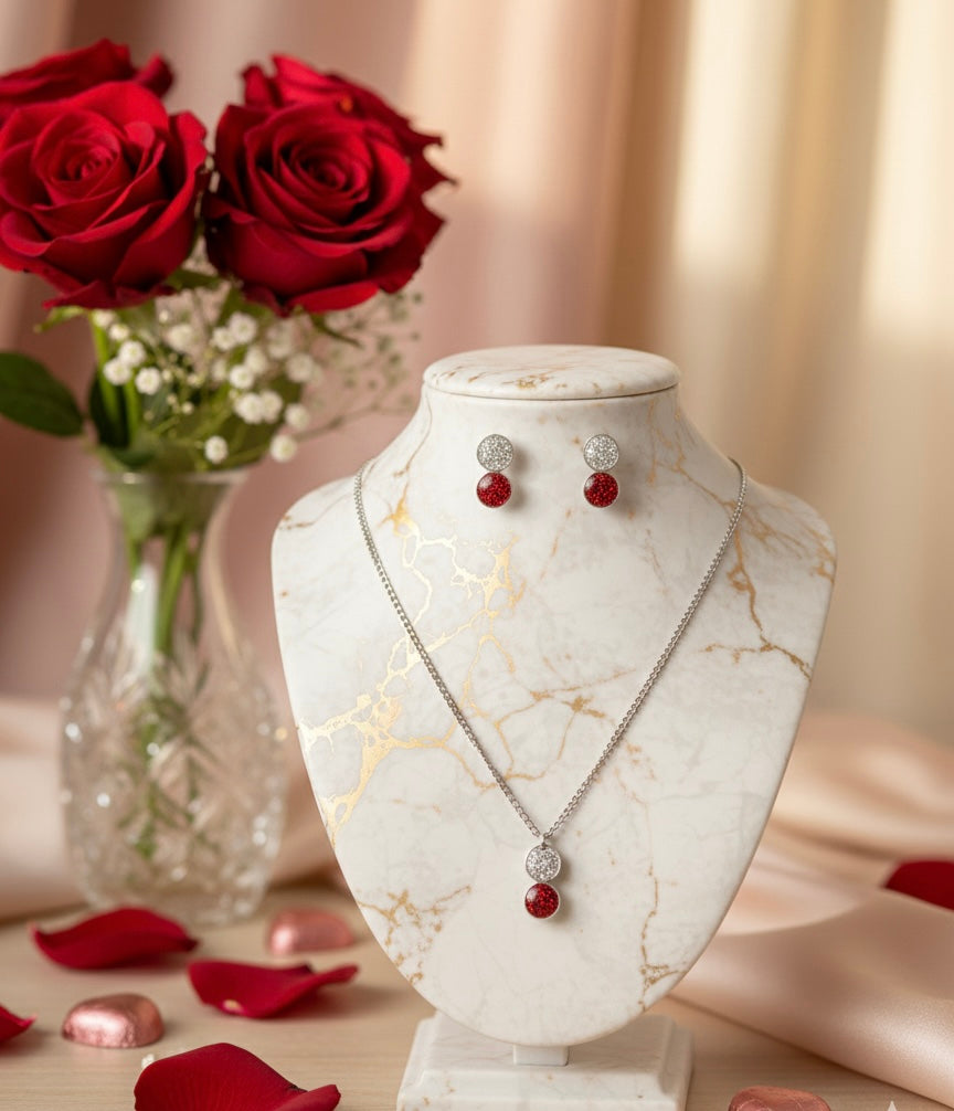 Metalwork: The settings and chain are crafted in a bright, polished silver-tone metal, providing a cool-toned frame that makes the red pop.