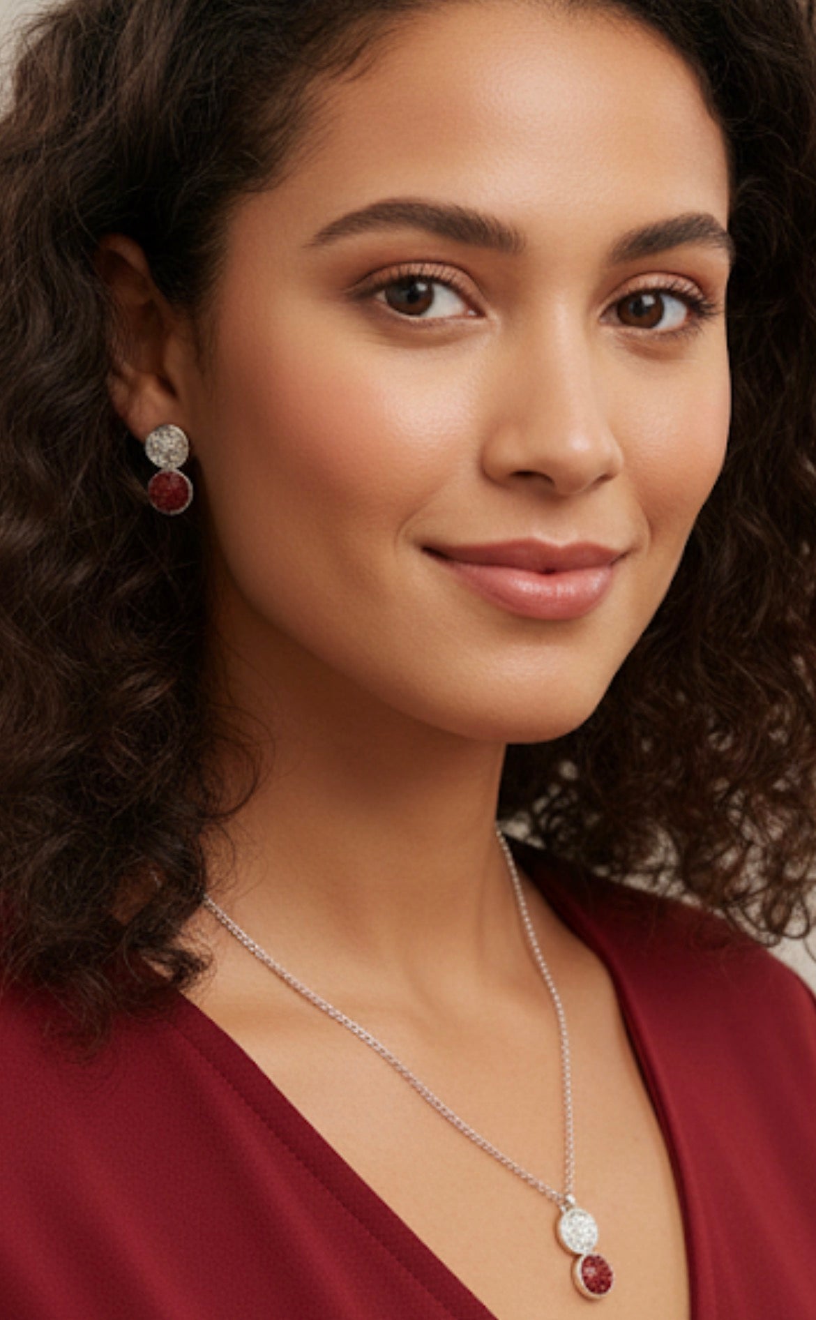 This set offers a striking balance of modern geometry and festive sparkle. It consists of a matching pendant necklace and stud earrings, designed with a clean, vertical "double-circle" silhouette.