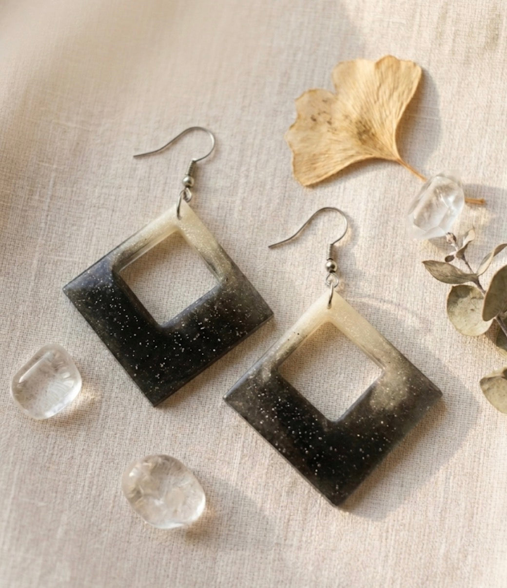 Crafted from resin, they feature a bold open-rhombus (diamond) silhouette that plays with negative space. The visual narrative of the pieces is defined by a vertical gradient (ombré) effect:
