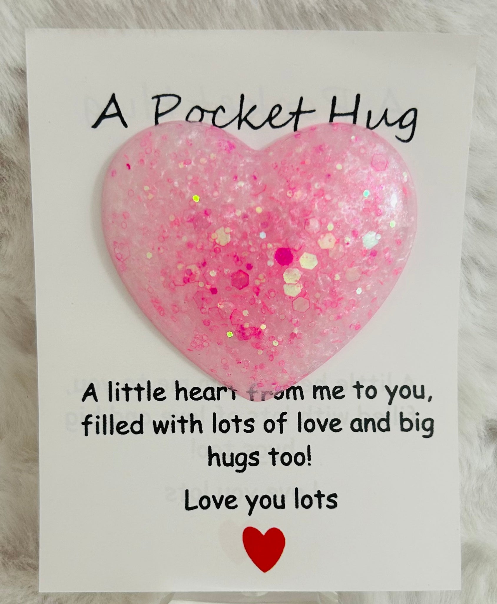 This charming pocket hug is a beautiful, heart-shaped resin piece in a soft, translucent pink. It's filled with a mix of different glitter shapes and sizes, including tiny flakes and small hexagons in shades of pink and iridescent white. The glitter gives the heart a lovely, shimmering effect. With its smooth, polished finish, this is a perfect, heartfelt gift to show someone you're thinking of them.