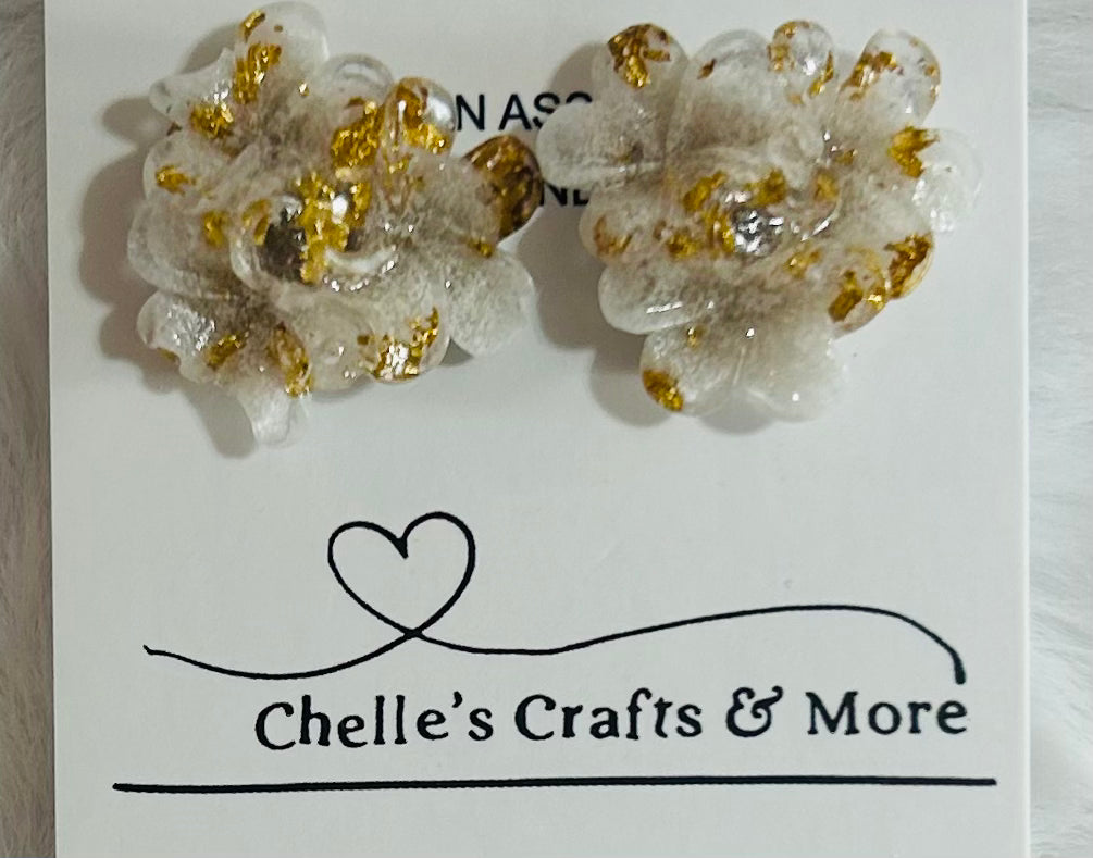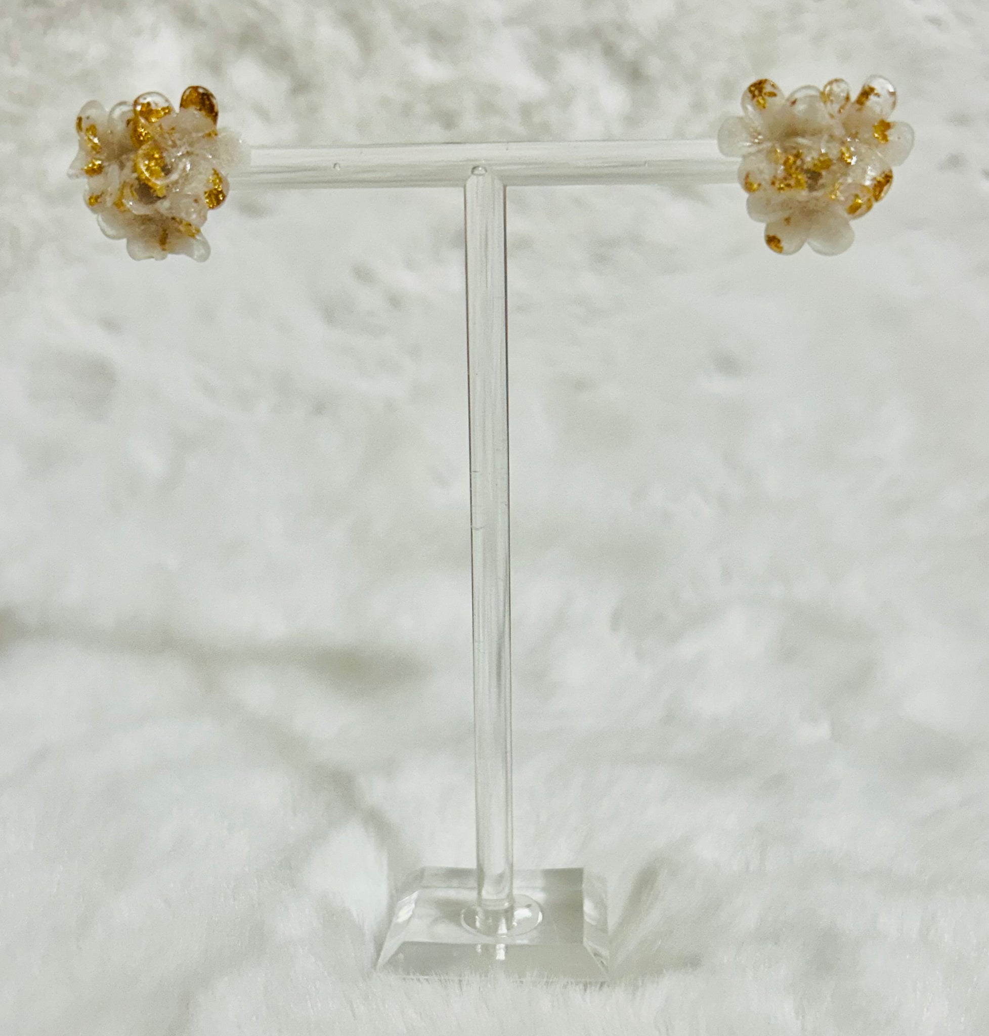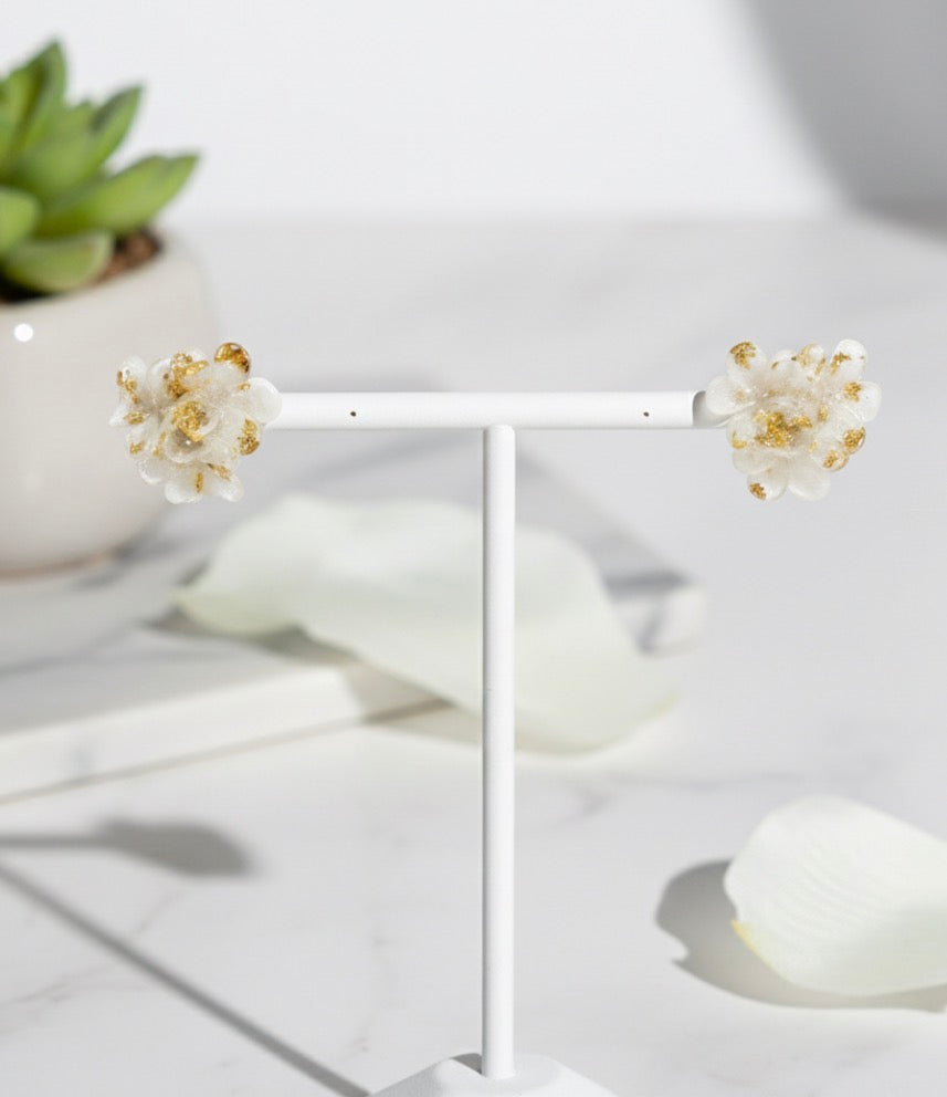 The defining feature is the inclusion of flakes of gold foil scattered throughout the white resin. This gold provides a beautiful, reflective shimmer and gives the earrings a luxurious, high-end feel.